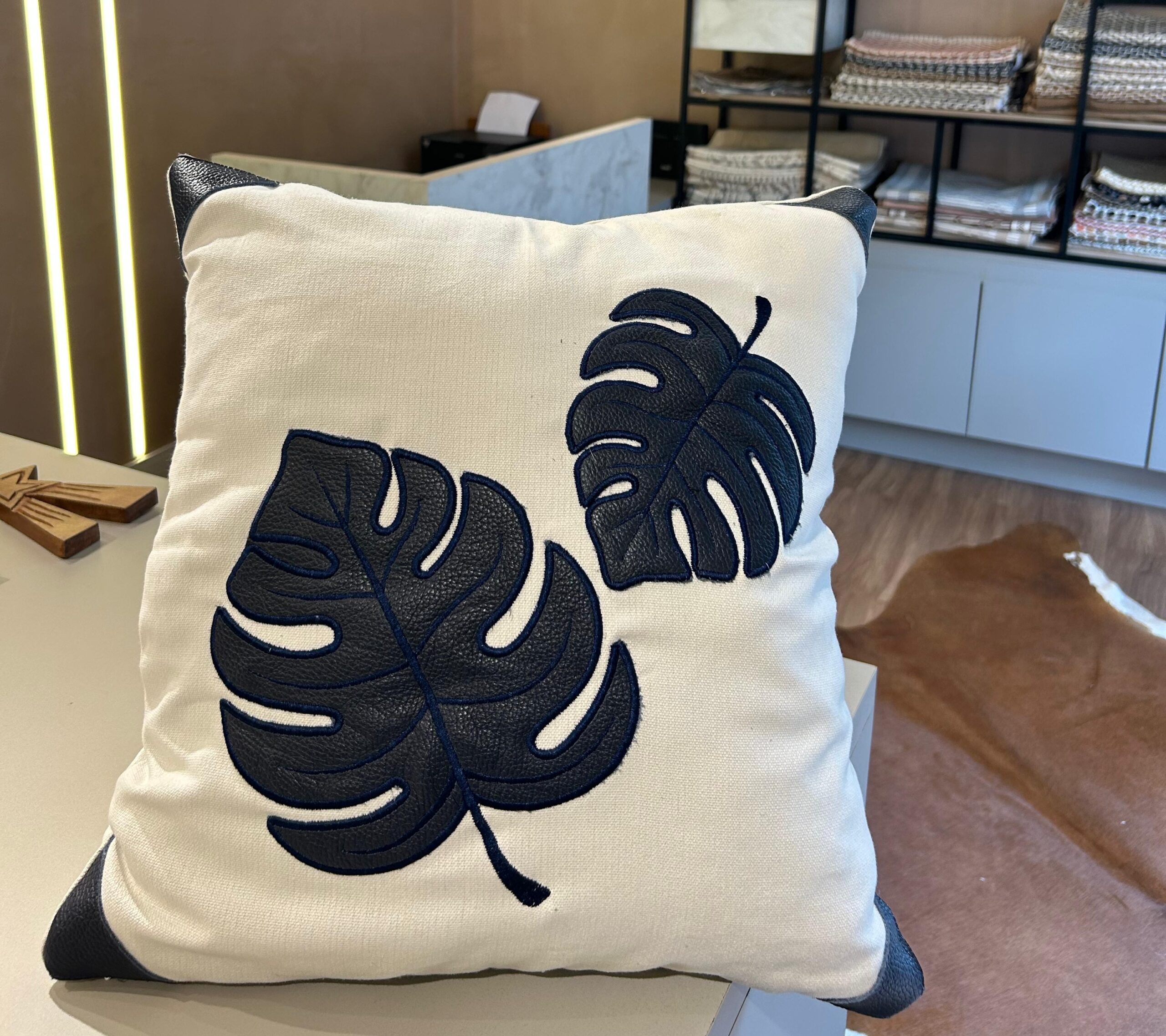 almofada off white bordada com couro azul