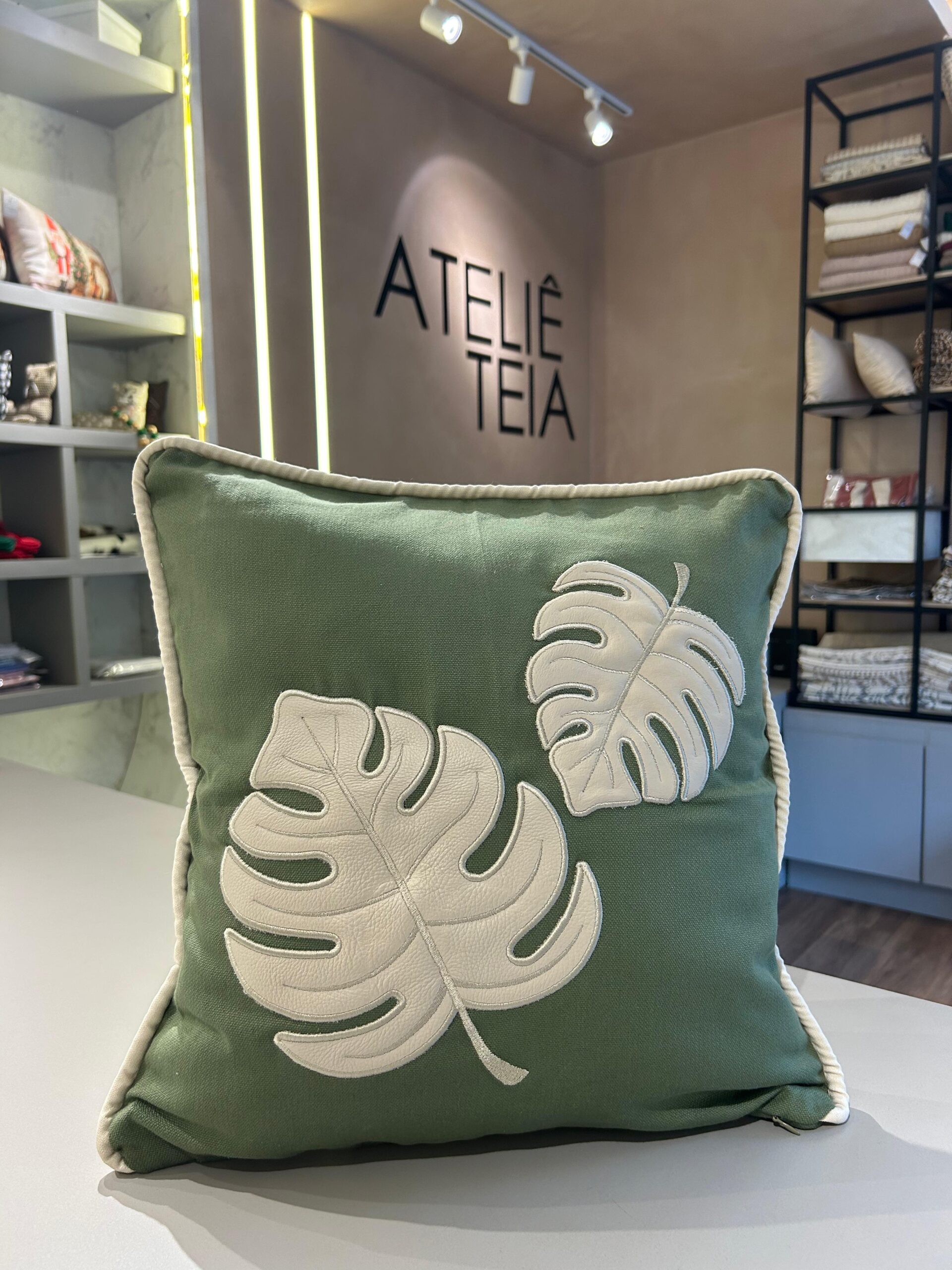 almofada verde bordada com couro branco