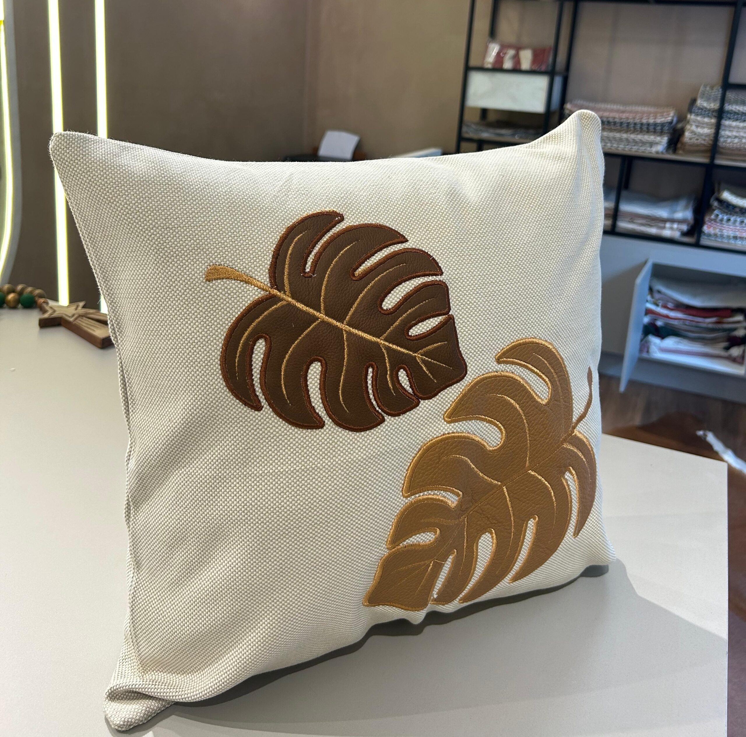 almofada off white bordada com couro marrom